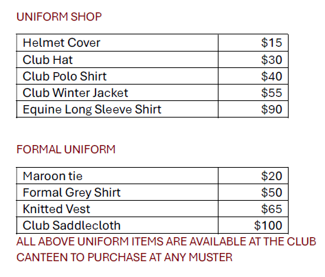 Uniforms can be purchased at the canteen prior to or during musters. At the commencement of the new year, new and returning members can purchase items at the first working bee of the year prior to the first ridden muster.